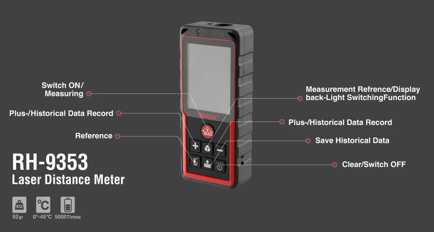 Ronix RH-9353 is a fully-featured and robust laser measurer that features long-range measuring with extreme accuracy of up to ±2mm and measures distances up to 50 meters for professional confidence. It has an automatic shutdown system in 3 minutes to protect the tool’s power.