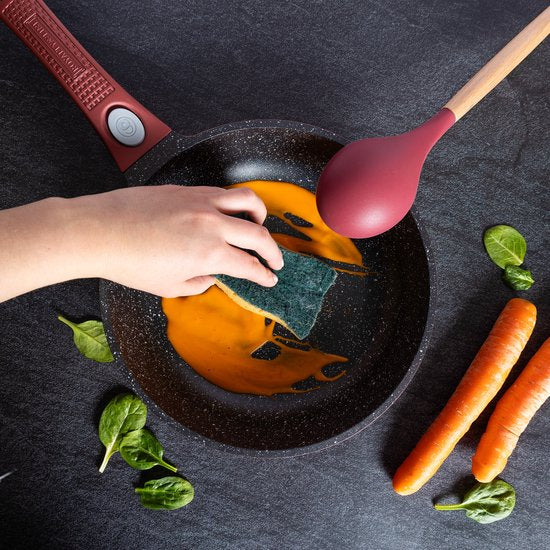- The set of pots includes: Sauce pan 16cm, Fry pan 24cm, Deep fry pan 28cm, Saucepan 20cm, 24cm saucepan, 28cm saucepan, Two pairs of silicone handle protector, Induction base