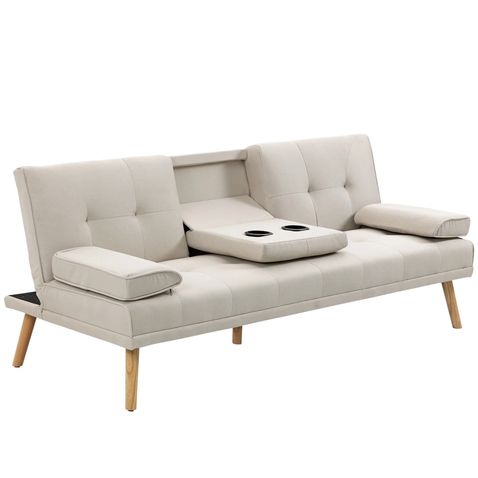 3 Seater Reclining Sofa Bed with Linen Effect Upholstery and Drop-Leaf Table, Beige