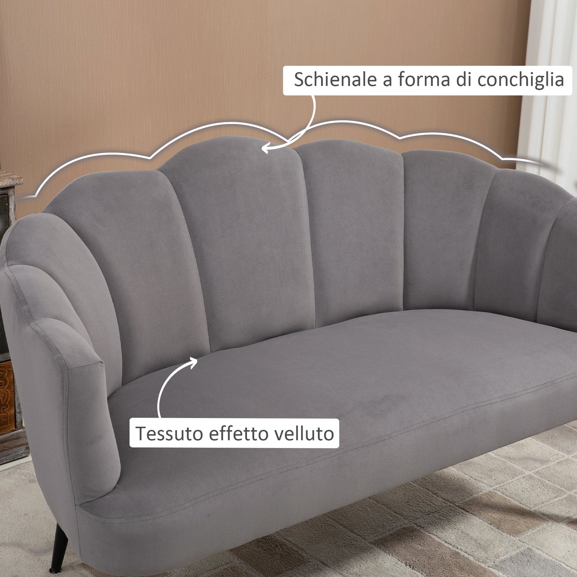 - ADD ELEGANCE TO YOUR SPACE: Make your home more chic with this 2 seater sofa, it has an elegant shell back design, velvet upholstery and black metallic legs.