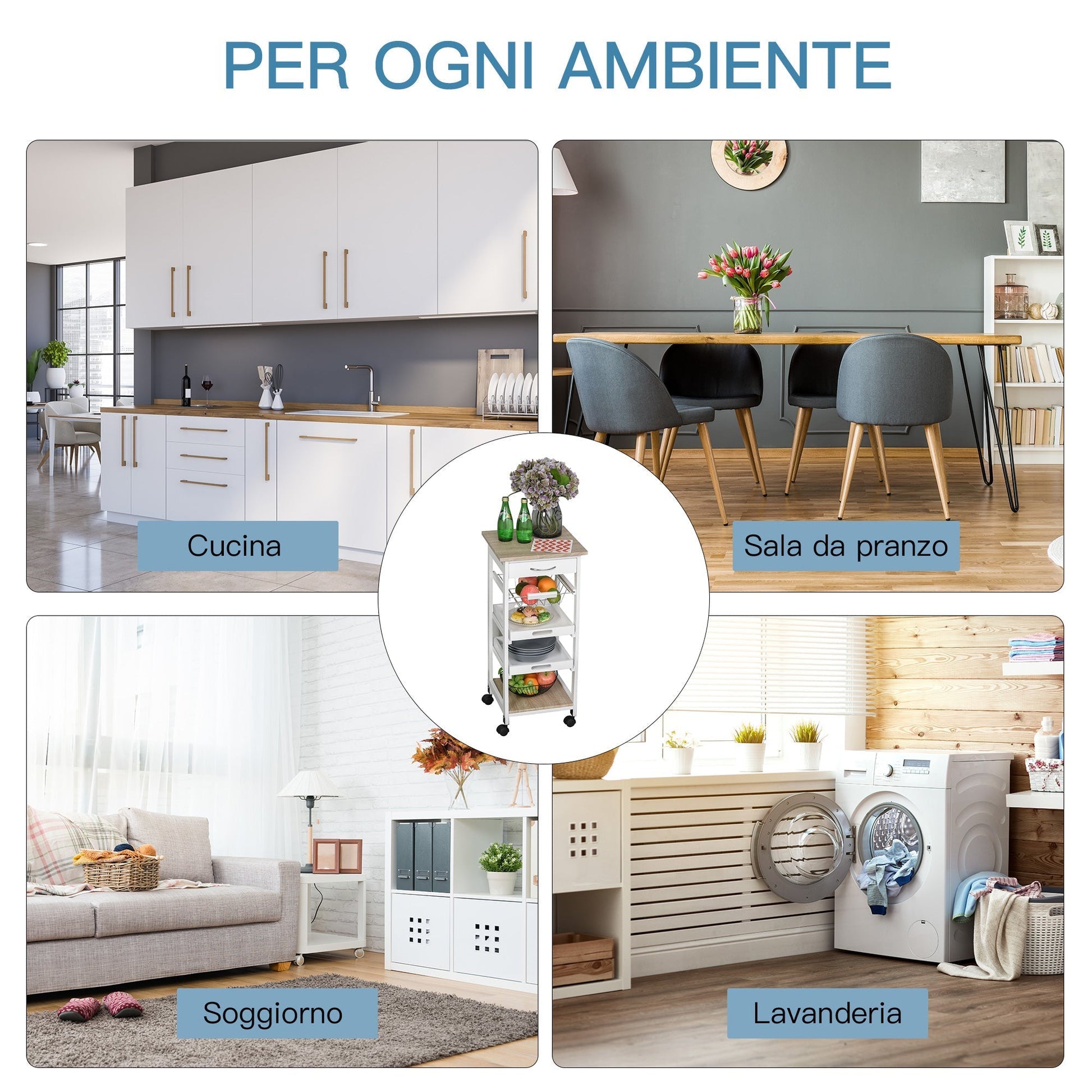 Compact, elegant and resistant. Here is the perfect kitchen trolley even for the smallest kitchens! It has a drawer, a basket in metal wire, removable trays and a shelf to reorganize all your tools. Thanks to the 4 wheels, you can move it comfortably from one room to another, and have your accessories always ready for use.