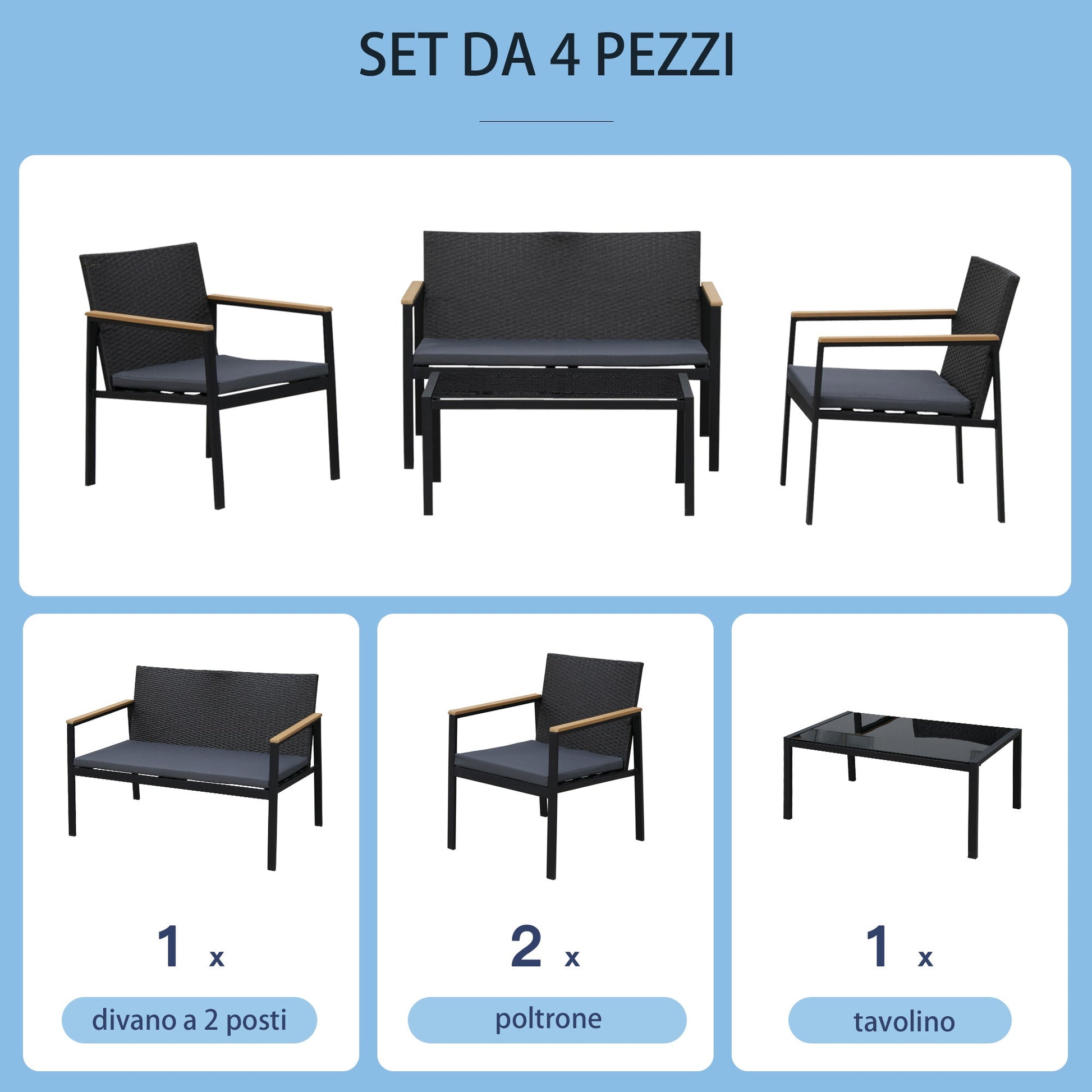 4-Piece Outdoor Lounge Set with 2 Chairs, Sofa and Coffee Table, Garden Furniture in Rattan and Black Steel