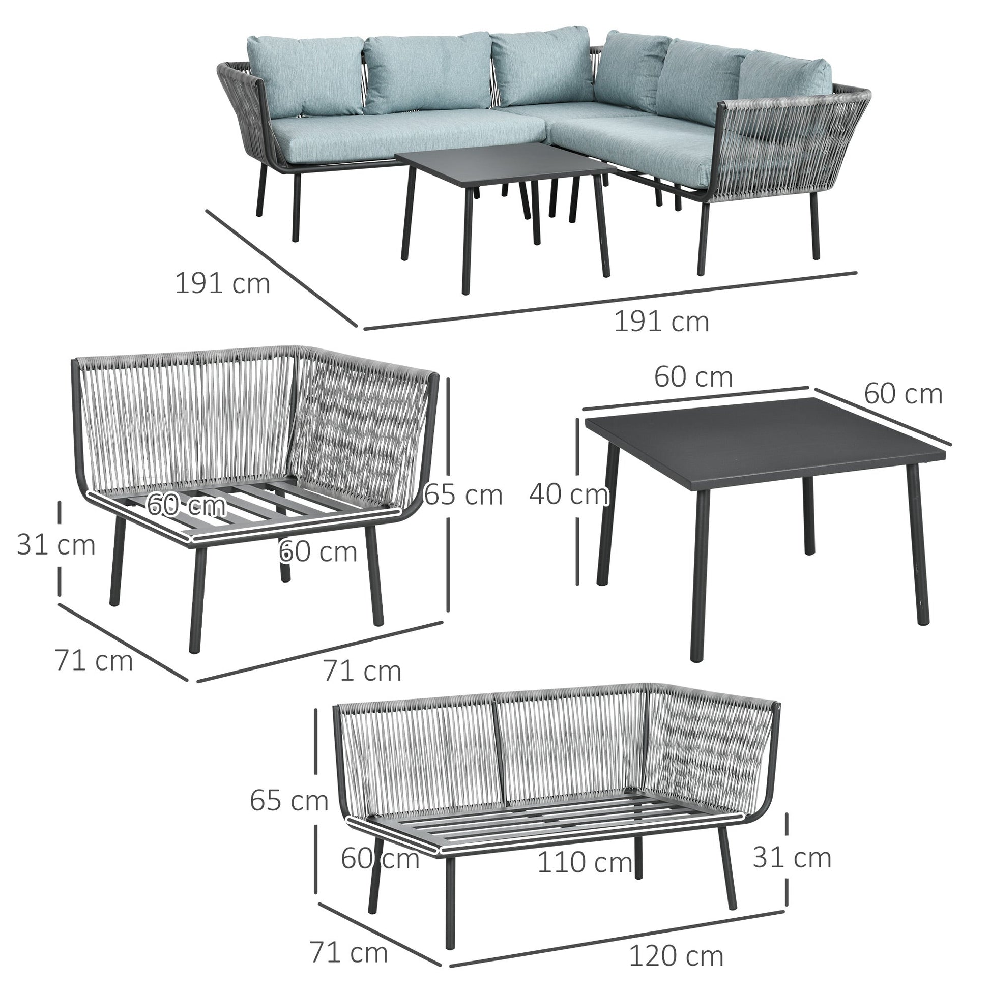 - DIMENSIONS: Double corner sofa dimensions (left): 120W x 71D x 65H cm. Armchair dimensions (right): 71W x 71D x 65H cm. Garden table dimensions: 60W x 60D x 40H cm. Load capacity: 240 kg (double sofa), 120 kg (corner sofa), 30 kg (coffee table). Assembly required