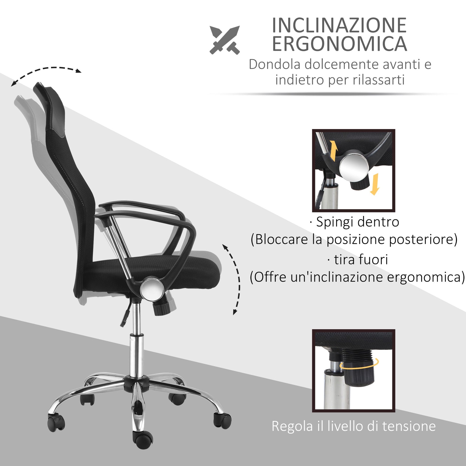Ergonomic Office Chair Swivel and Rocking with Wheels, Adjustable Height and Mesh Backrest, 63x65x109-119 cm, Black