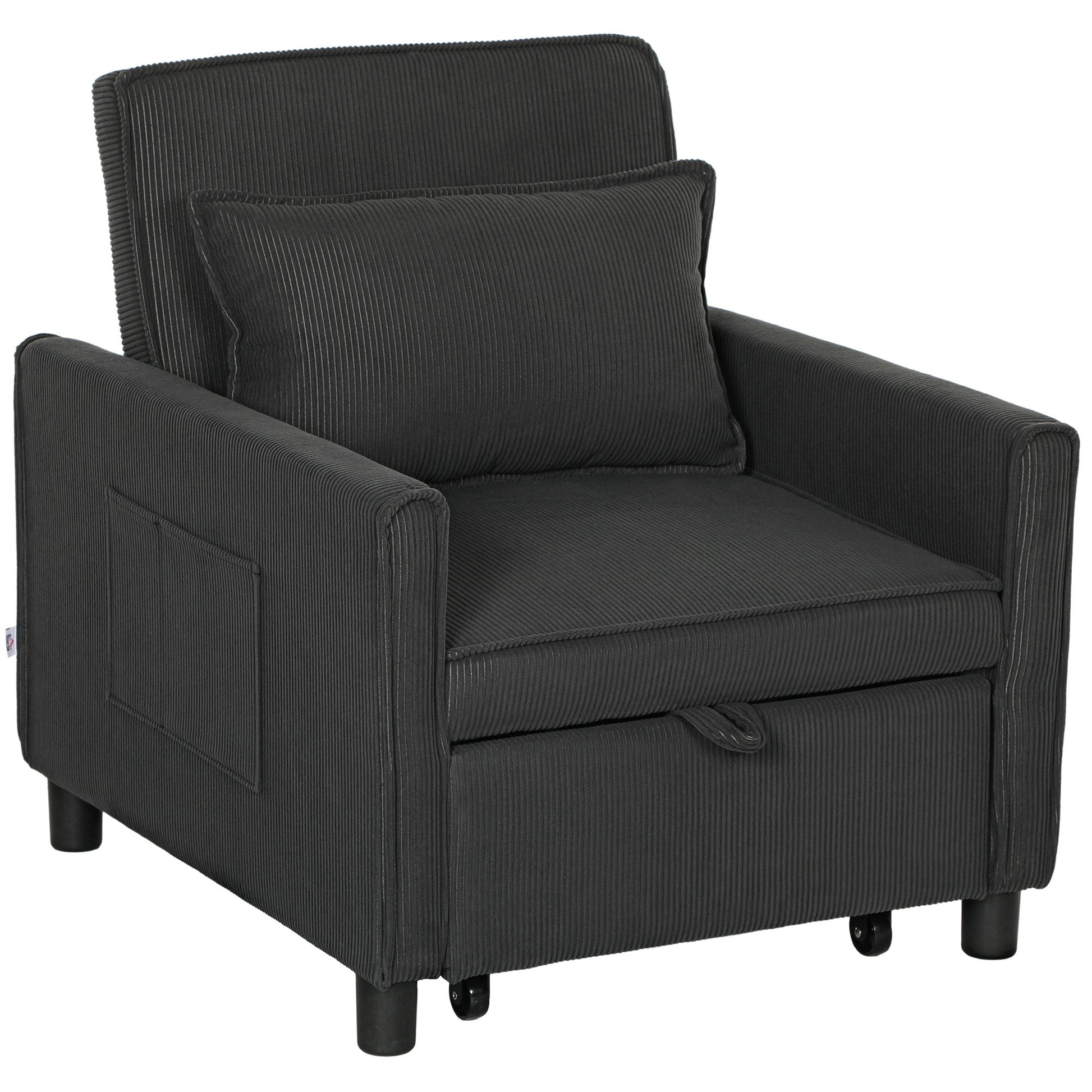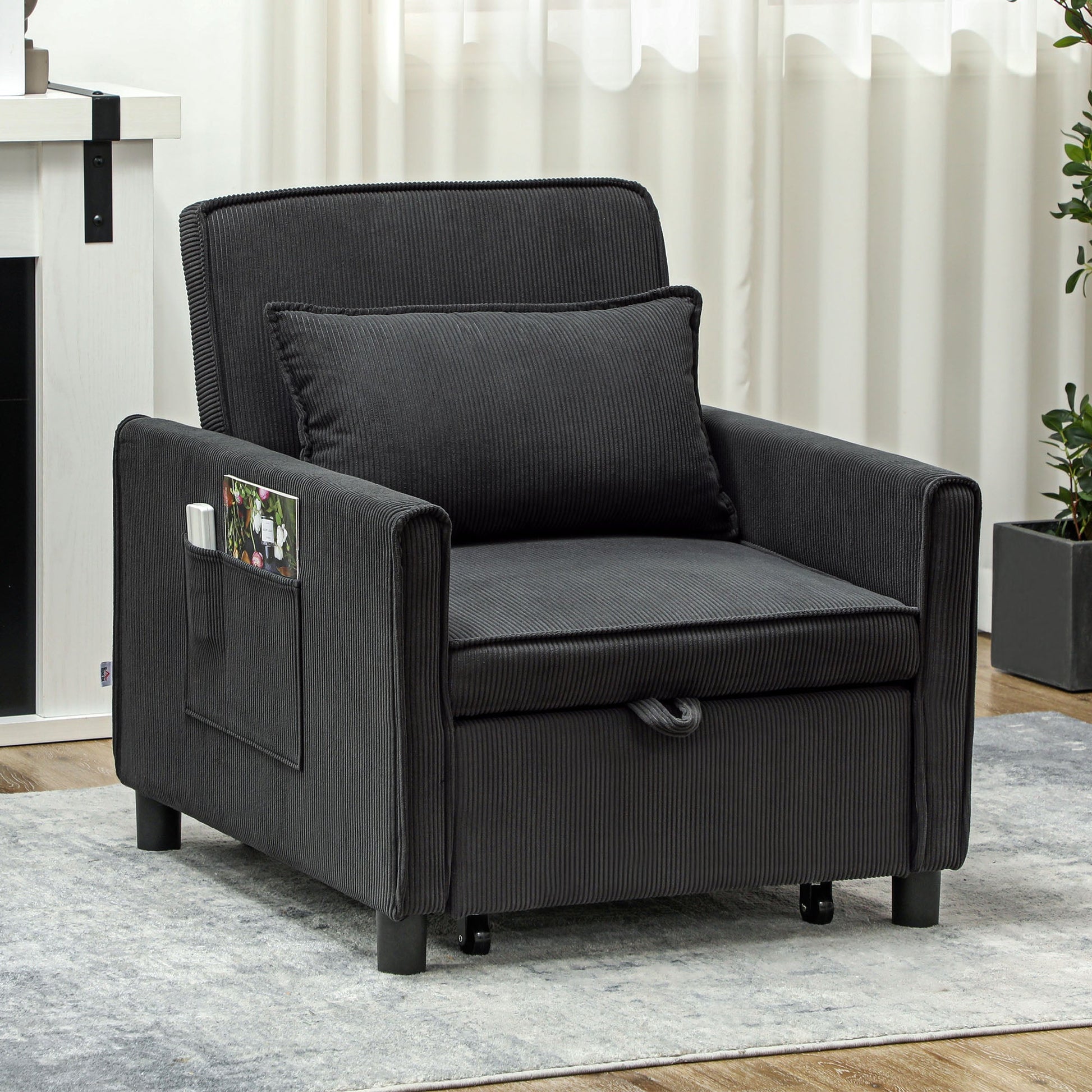 - CONVERTIBLE SEAT: This multifunctional bed chair can easily transform from a lounge chair or recliner into a comfortable temporary bed with a pull-out mechanism. Place this chair in your home, office or other space-constrained environment