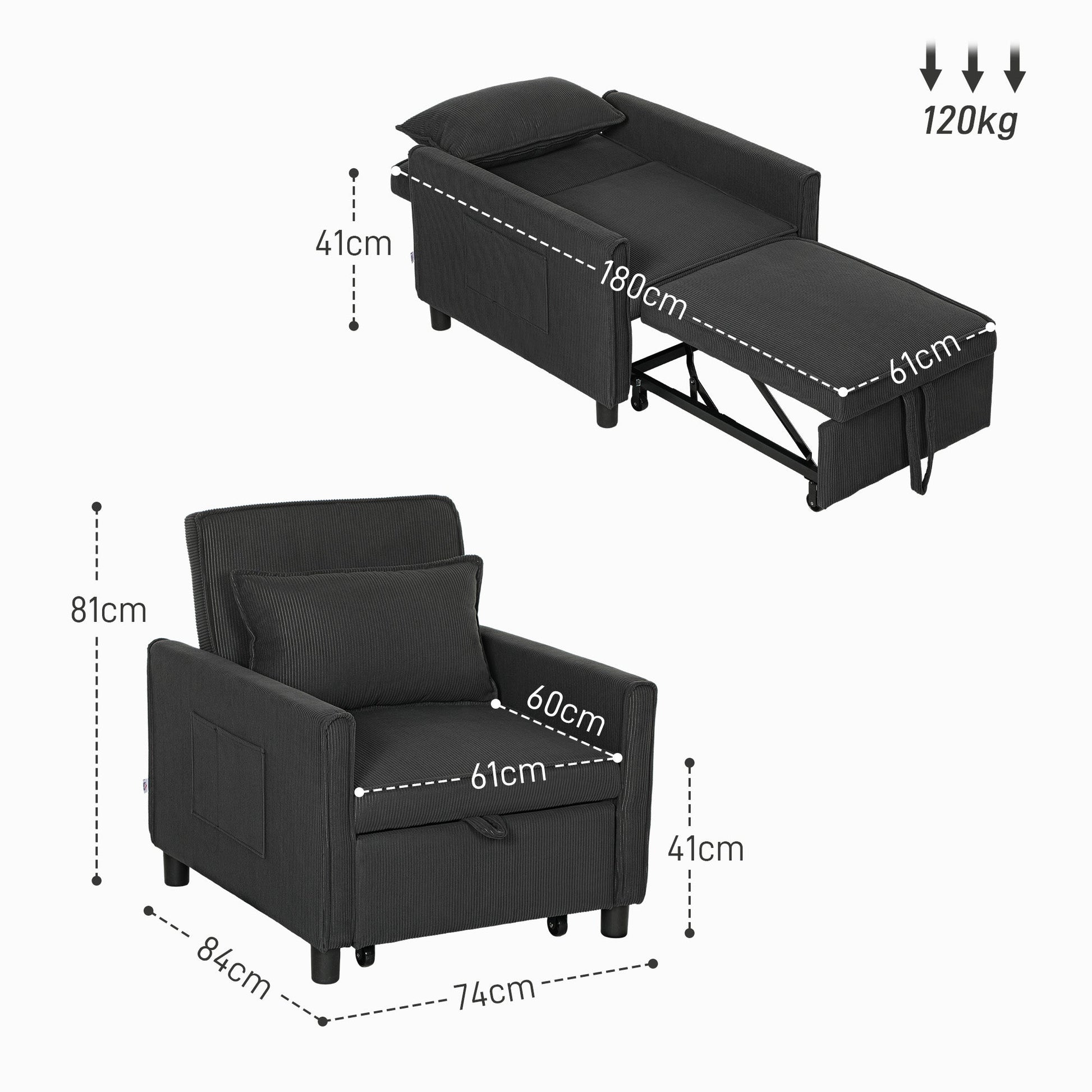 - DIMENSIONS: Chair Dimensions: 74L x 84D x 81H cm. Bed Dimensions: 61L x 180D x 41H cm. Weight Capacity: 120 kg. Assembly Required