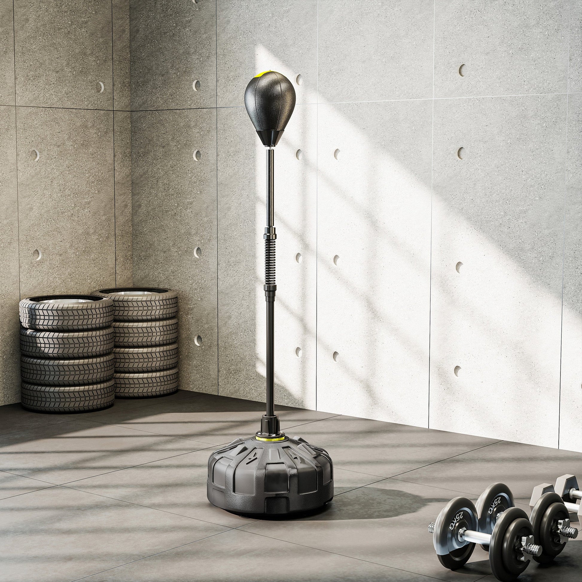 - FILLING BASE: The base of the free-standing punching bag can be filled with water or sand and is equipped with practical, grippy suction cups, ensuring the necessary stability during use. The base can hold 25 kg of sand, 15 kg of water, or 20 kg of mix.