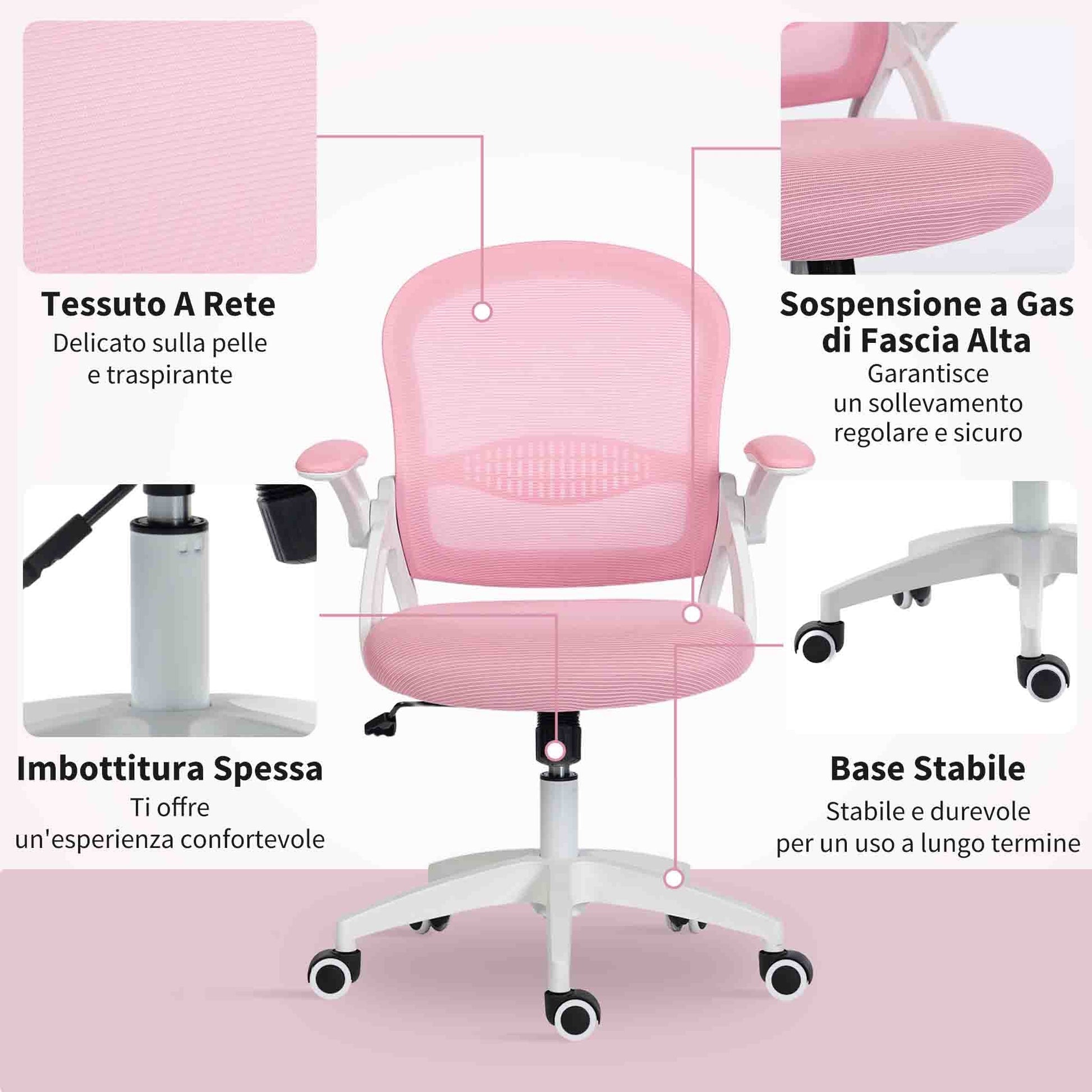 Ergonomic and Adjustable Office Chair with Mesh Backrest and Padded Seat, 65.5x61.5x88-97.5 cm, Pink