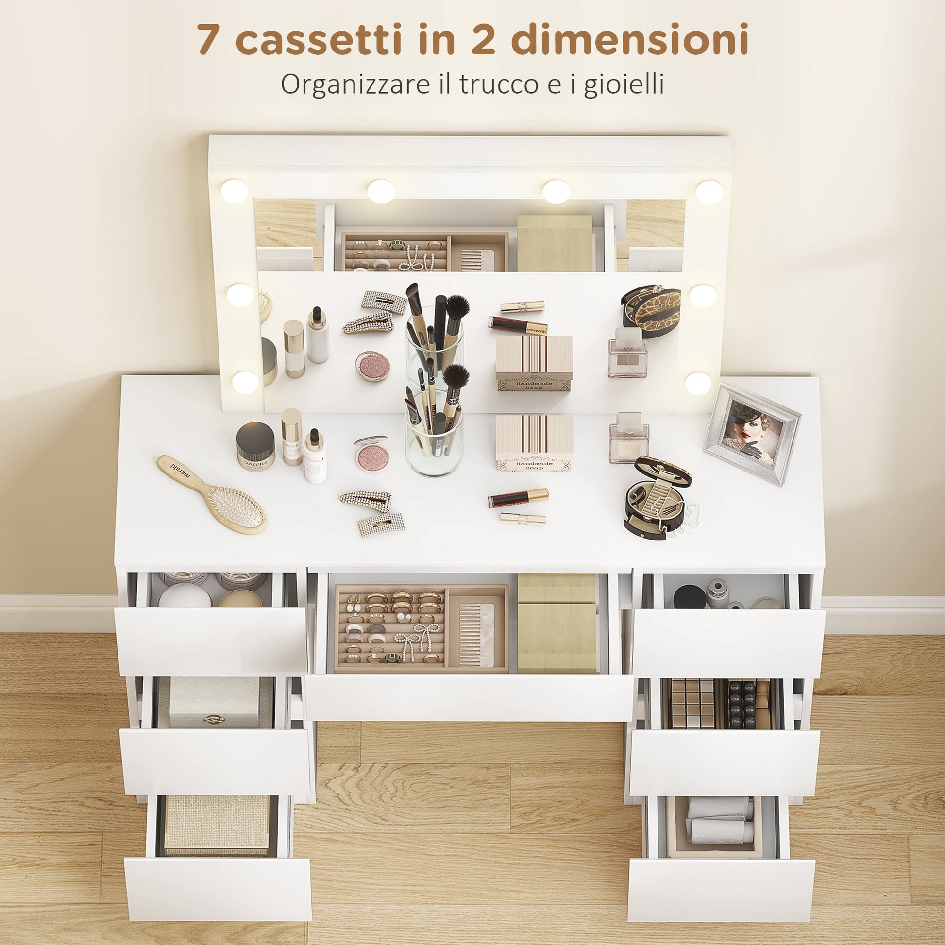 Hollywood-Style Makeup Table with Mirror, 8 LED Lights, 7 Drawers and Padded Stool, White