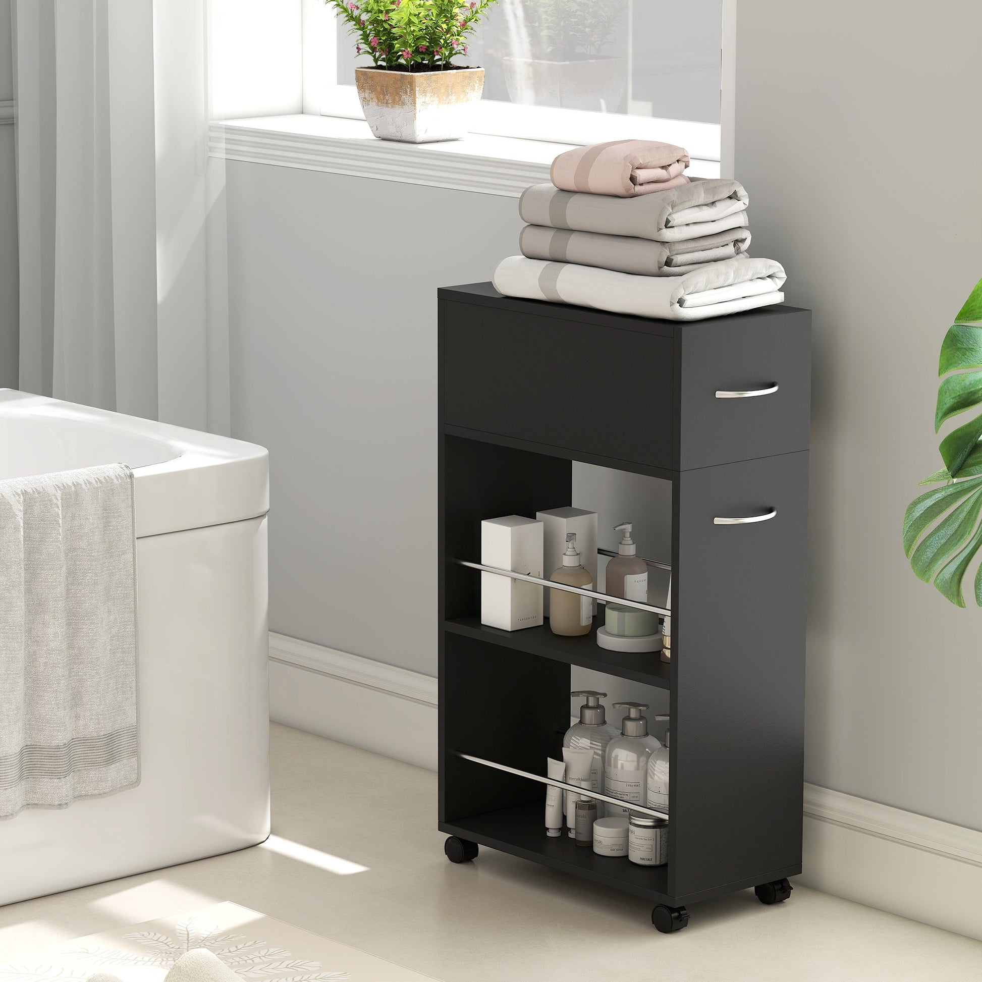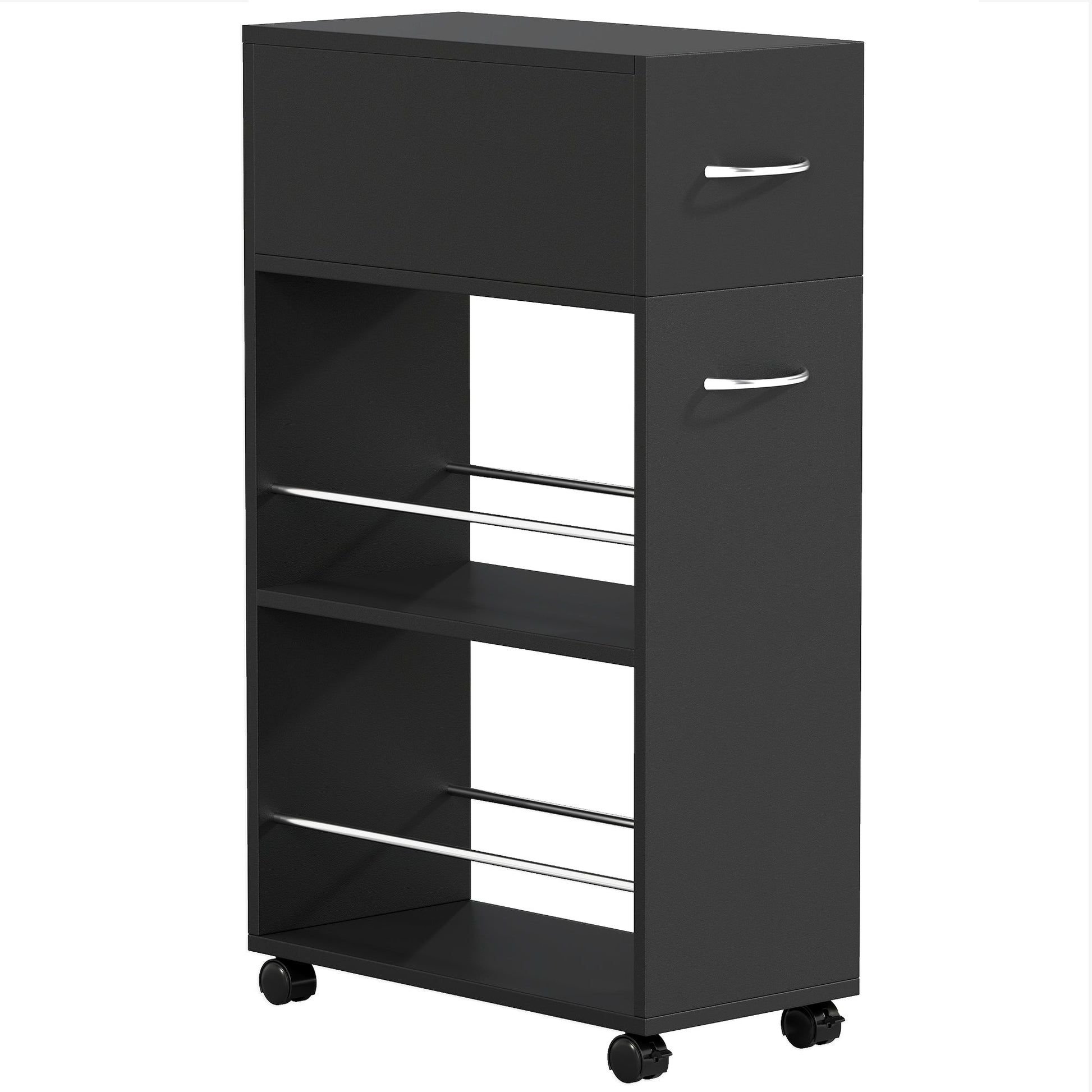 Kitchen Cart with 2 Open Shelves, Drawer and Rails, Wood and Stainless Steel, 25x50x85 cm, Black