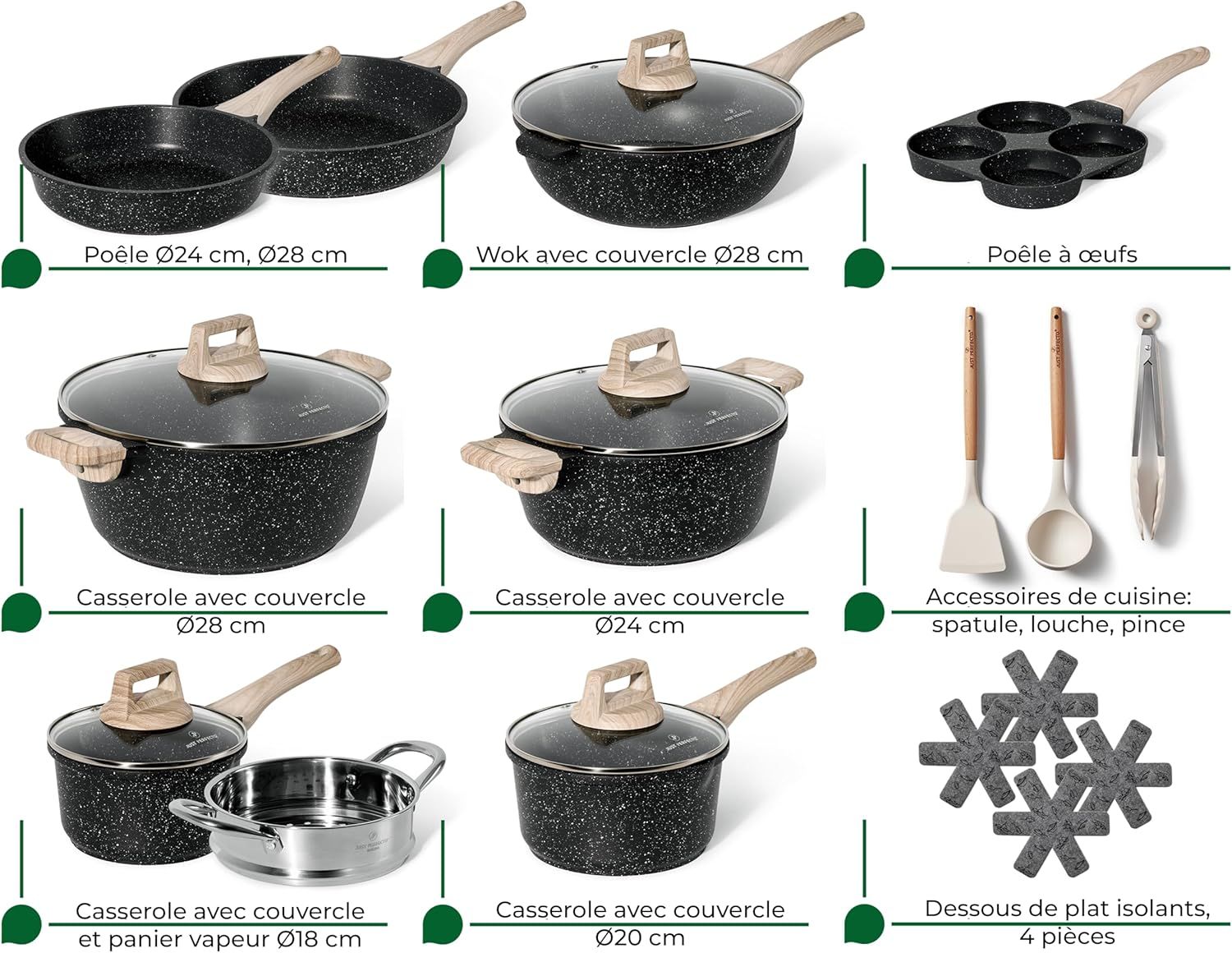 - Comprehensive 21-Piece Set: Includes a complete range of cookware—pots, frying pans, a steamer, egg pan, and utensils—covering every cooking need from everyday meals to special occasions.