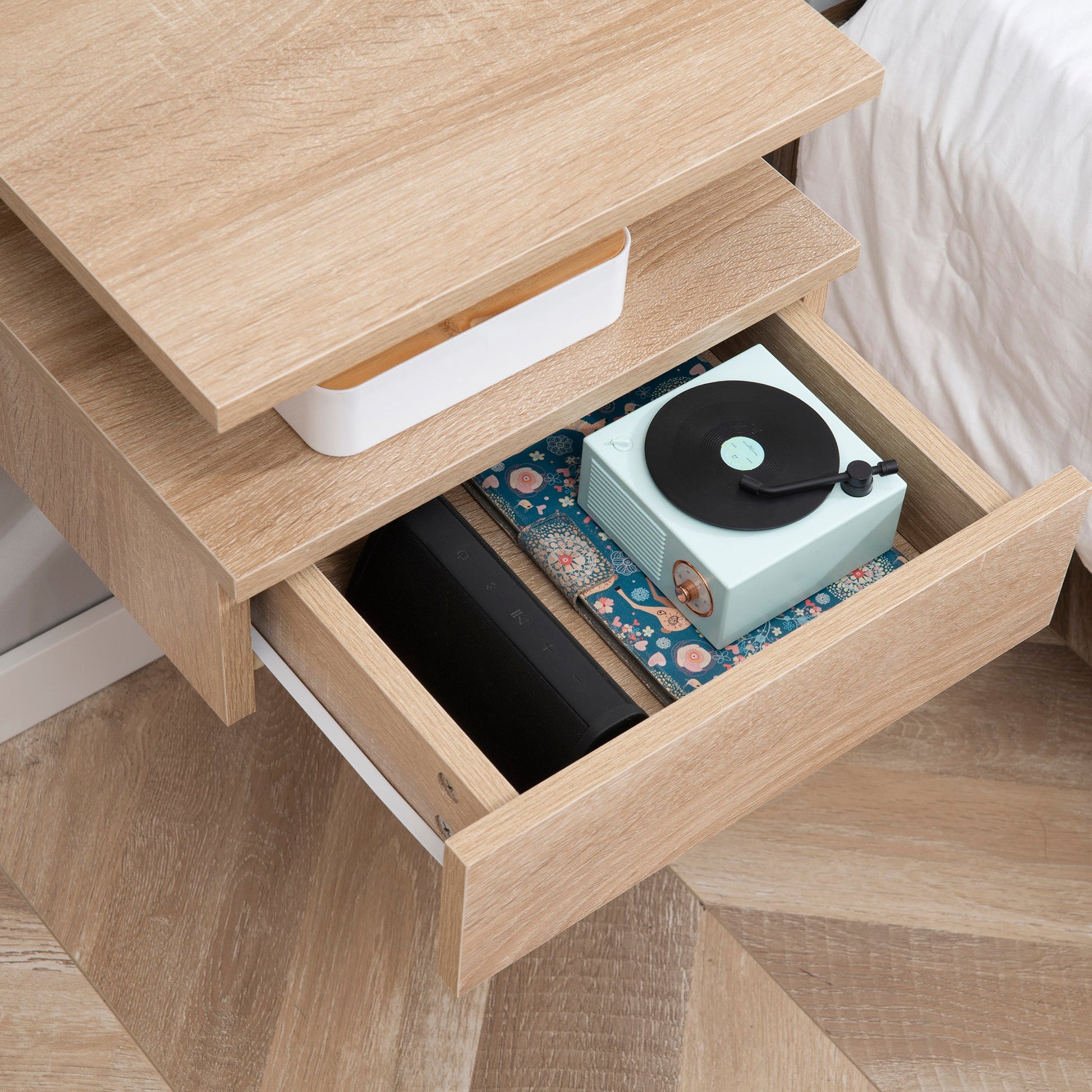 Set of 2 Modern Floating Bedside Tables with Drawer and Wooden Shelf 35x32x22.5cm, Oak