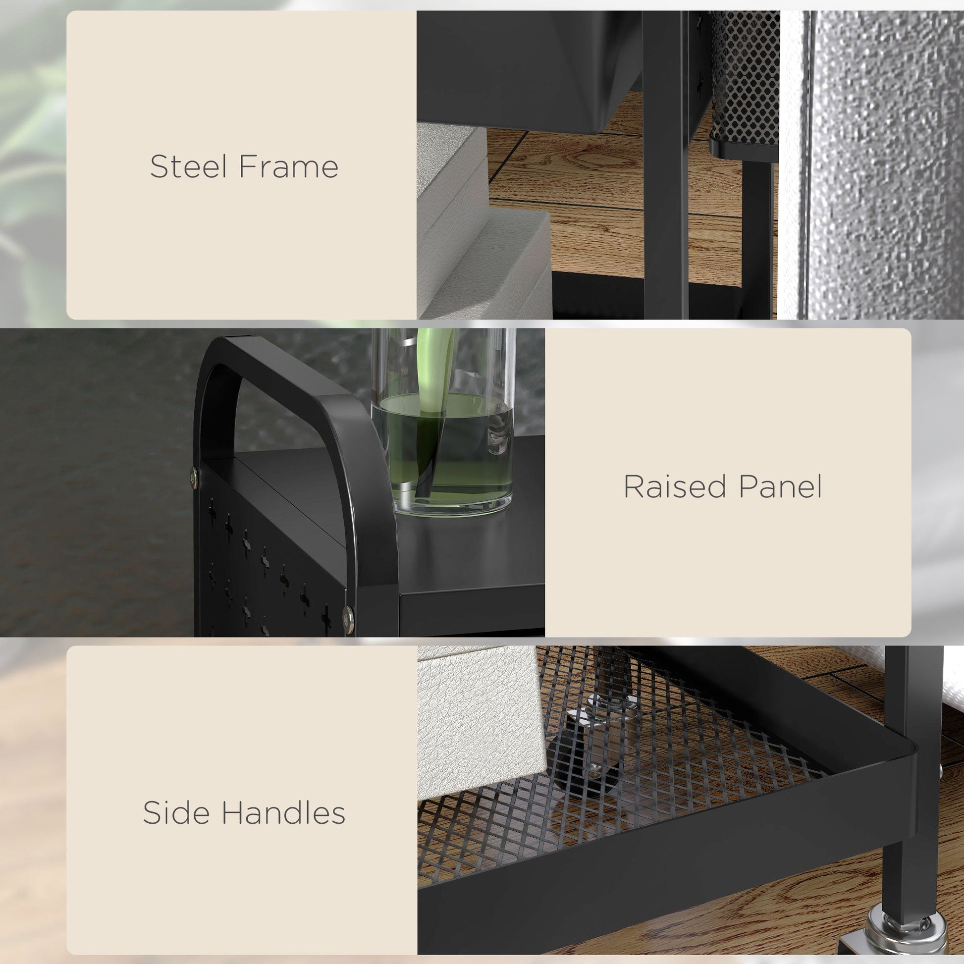 - • Kitchen trolley with 4 smooth-rolling wheels for mobility, 2 of which are lockable