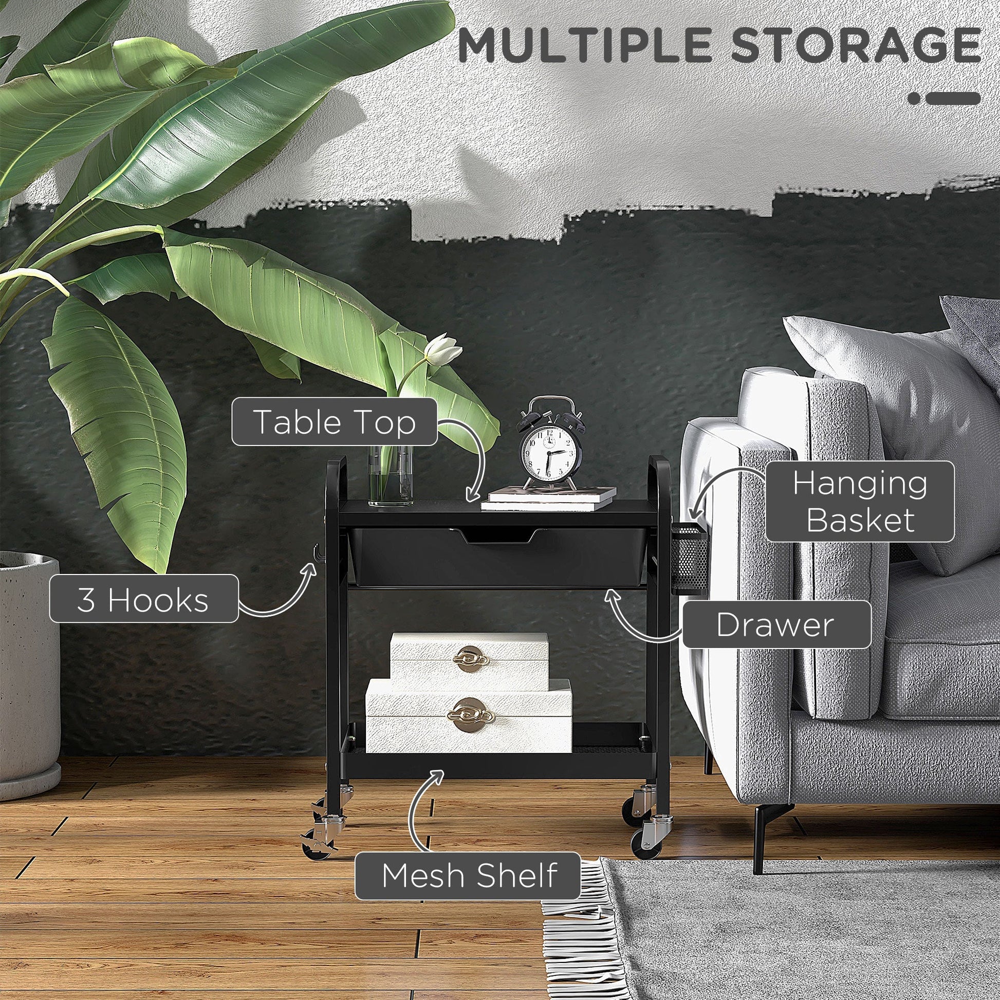 Kitchen and Multi-use Trolley with Basket, Removable Drawer and 3 Hooks, in PP and Metal, 61x32.6x58.5 cm, Black