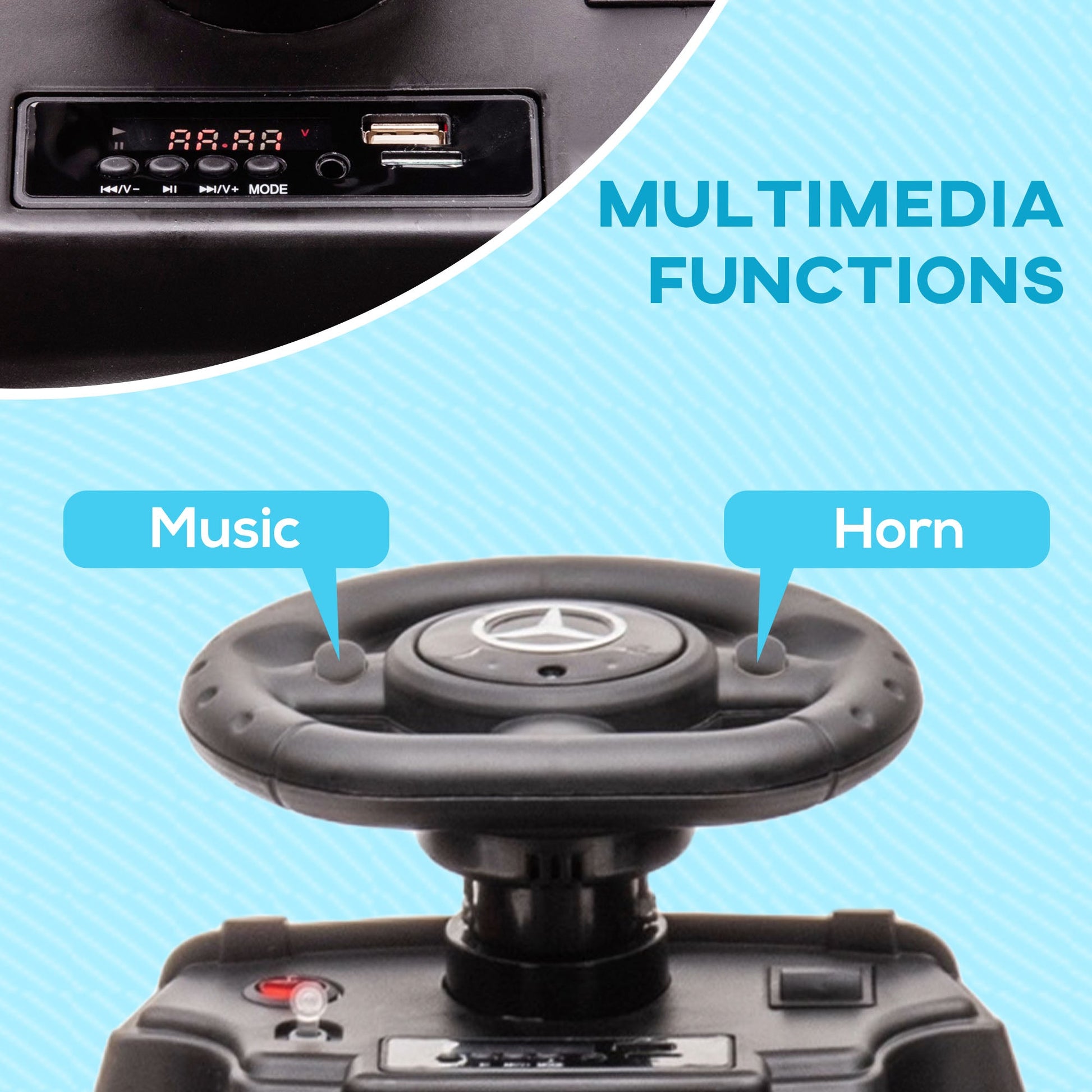 - FUN TO DRIVE: The steering wheel with horn, music control buttons and dashboard with lights help make the kids car more realistic. This ride-on toy also comes with a connection to connect their favorite music while driving