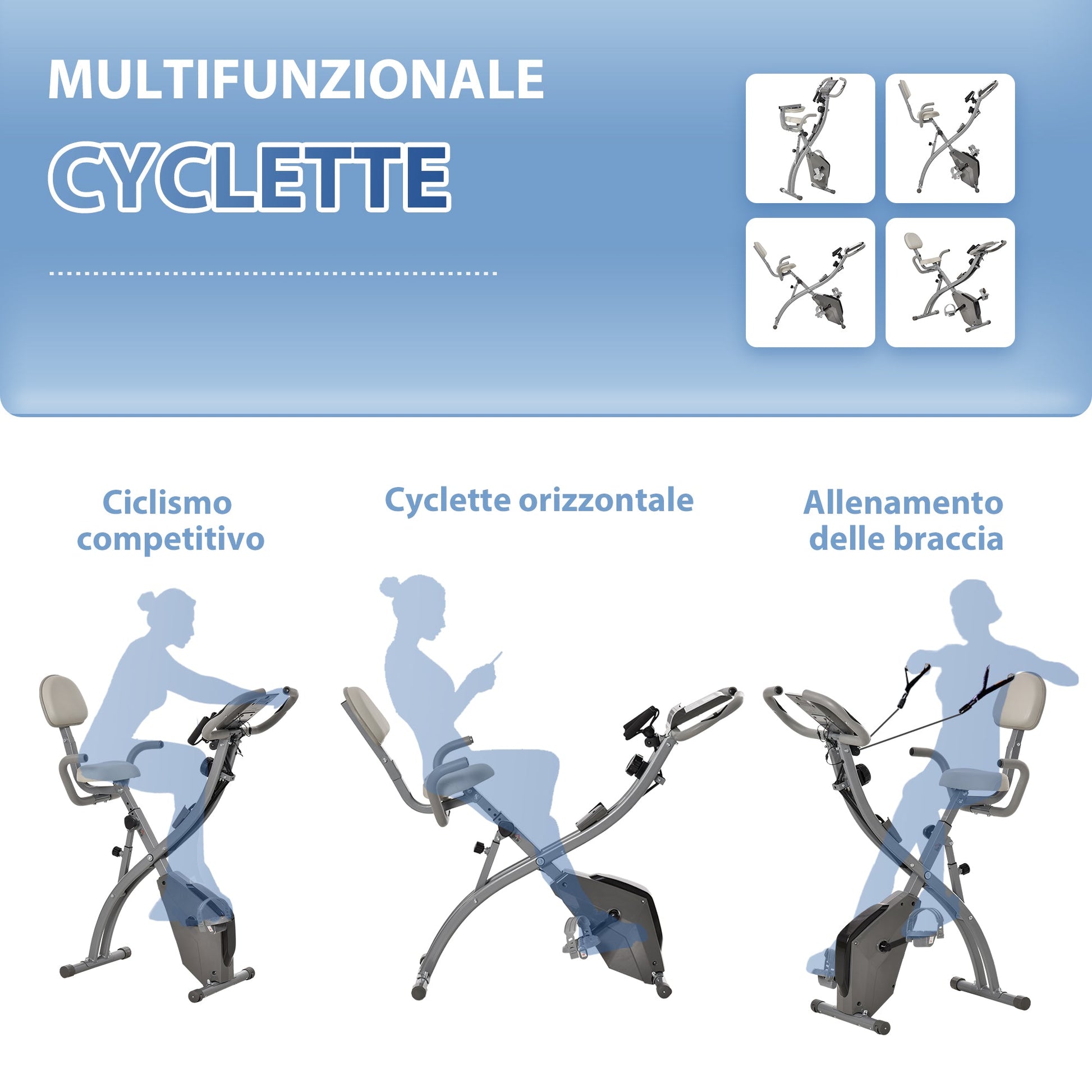 - TOTAL BODY WORKOUT: With a 2-in-1 design, this upright and recumbent bike is the perfect tool for a total body workout. It features elastic cords to train your arms while you pedal, and you can use it as a home exercise bike, in the gym or in the office.