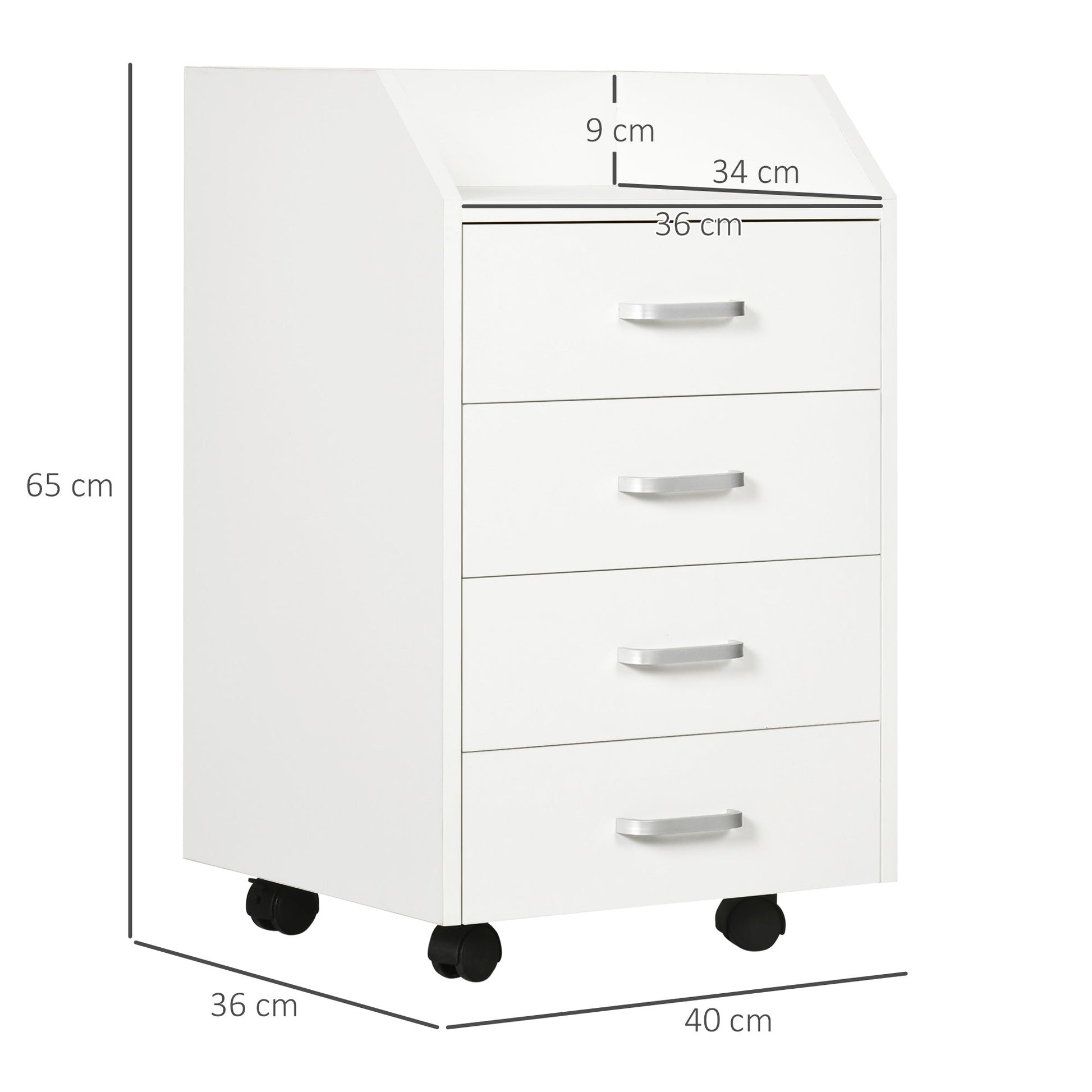 Wooden Office Chest with 4 Drawers, Wheels and Raised Edges, 40x36x65cm, White
