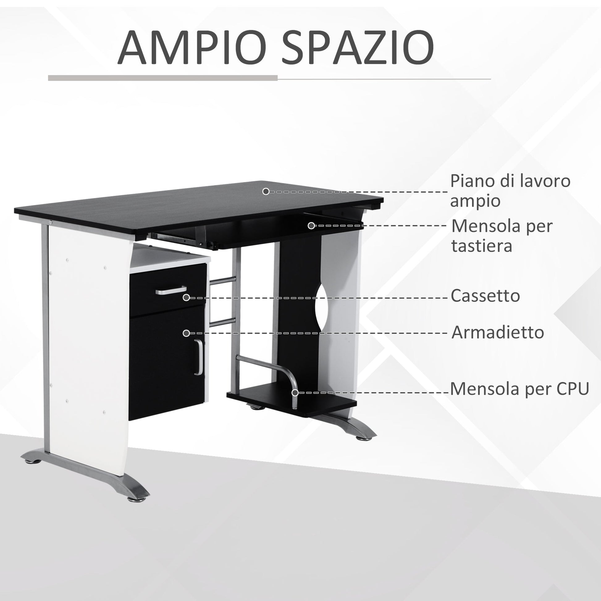 Computer Desk with Shelf, Drawer and Cabinet, in MDF and Iron, 100x52x75 cm, White and Black