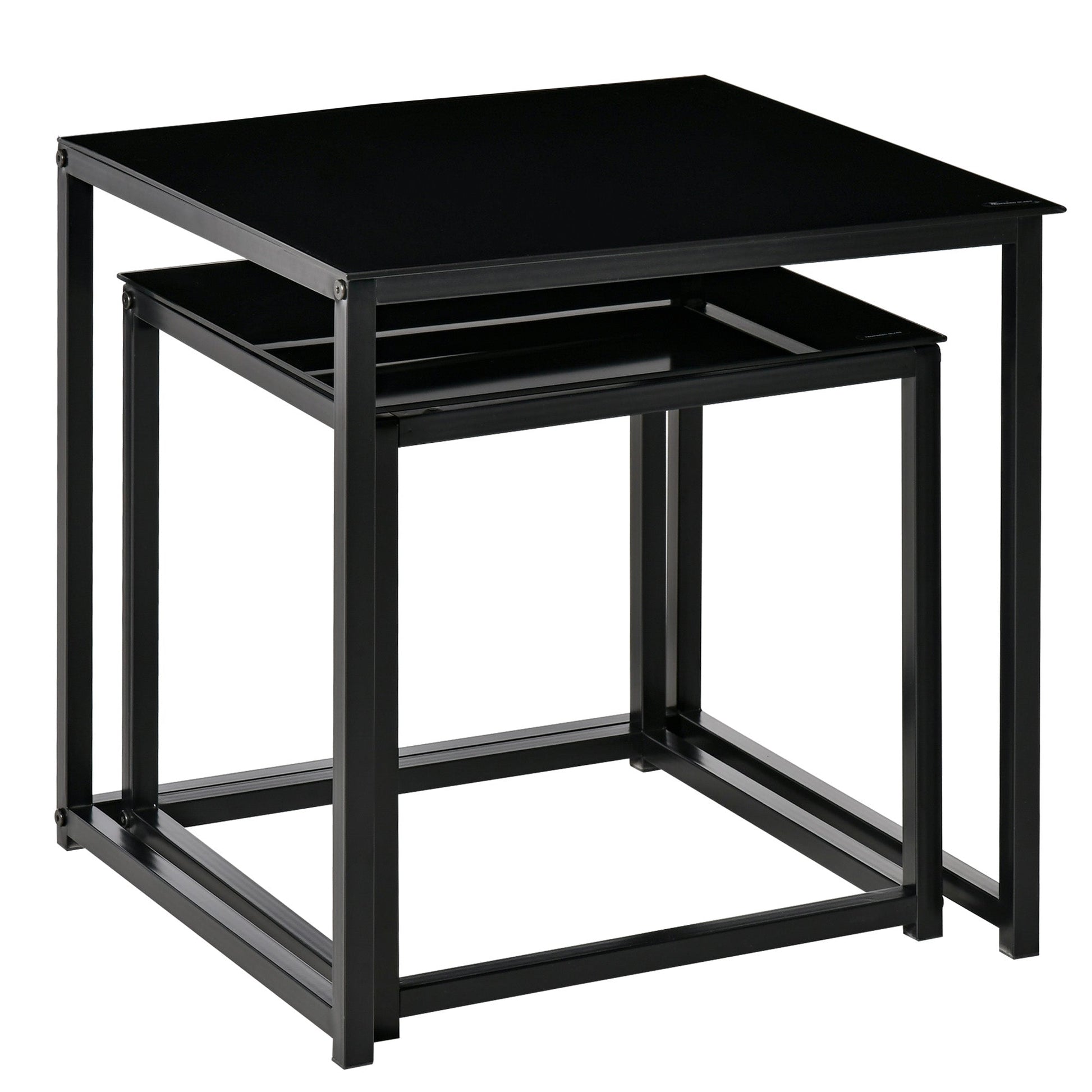 Set of 2 Modern Square Coffee Tables, in Steel and Tempered Glass, Black