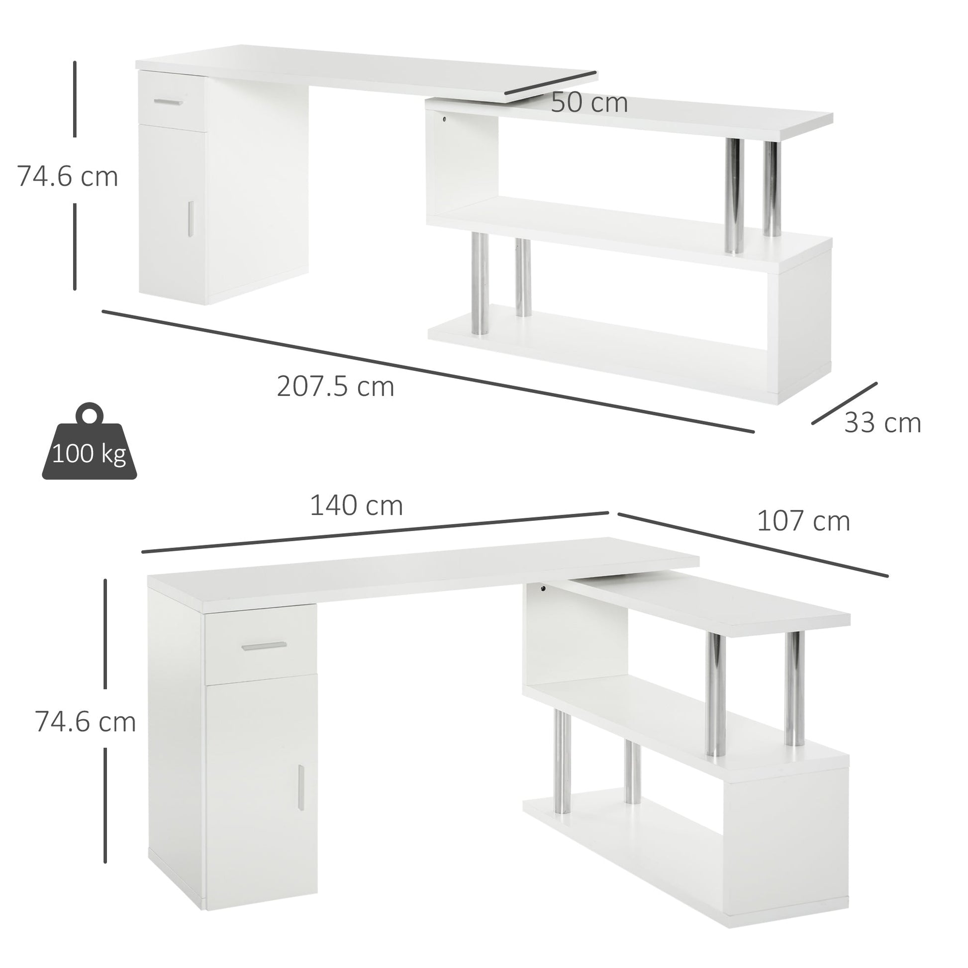 - DIMENSIONS: Overall Dimensions (L-Shape): 140W x 107D x 74.6Hcm. Dimension (Aligned Sections): 207.5W x 50D x 74.6Hcm. Weight Capacity: 100kg (Total), 50kg (Desk), 20kg (Shelf).