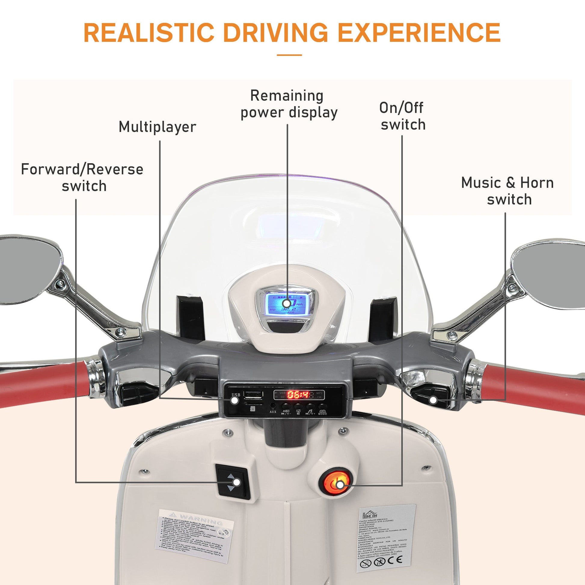 - REALISTIC LIGHTS AND SOUNDS: Thanks to the presence of lights and sounds included, our Vespa-licensed electric motorbike for children offers a realistic driving experience and fun play for your little riders.