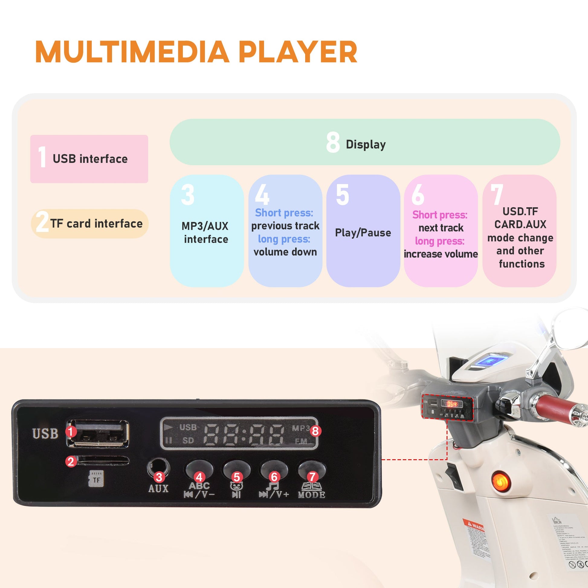 - • The presence of pedals and comfortable handlebars on the electric toy Vespa helps children aged 3 to 6 years to drive