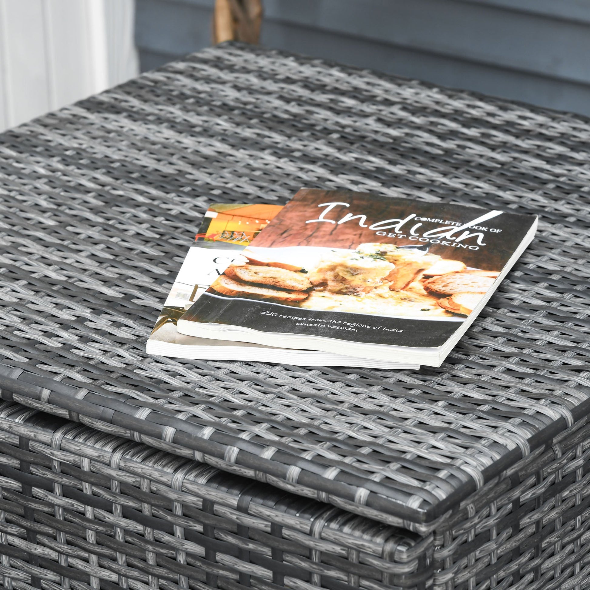 - 2 TABLES: This garden set includes 2 tables. A coffee table with a 5mm thick tempered glass top and a high table with a storage drawer. The latter is to be placed between the 2 sofas to create an L-shaped set
