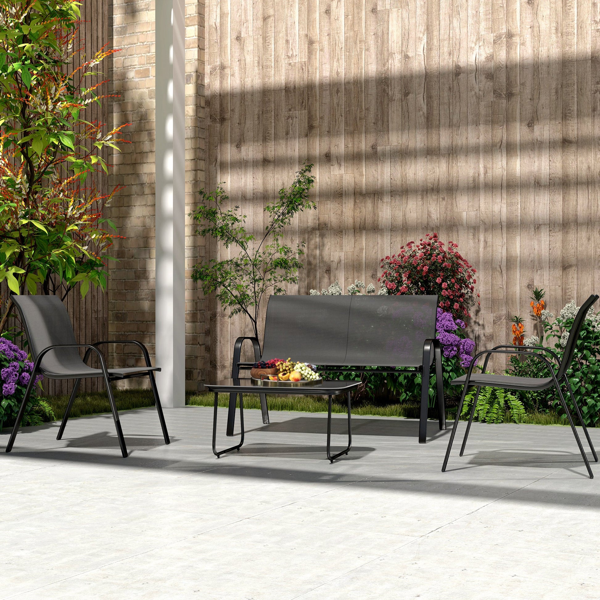 - FOUR-PIECE SET: This garden lounge set features a two-seater sofa, two stackable armchairs and a coffee table with a 5mm tempered glass top. Perfect for entertaining outdoors and adding an elegant touch to your outdoor spaces
