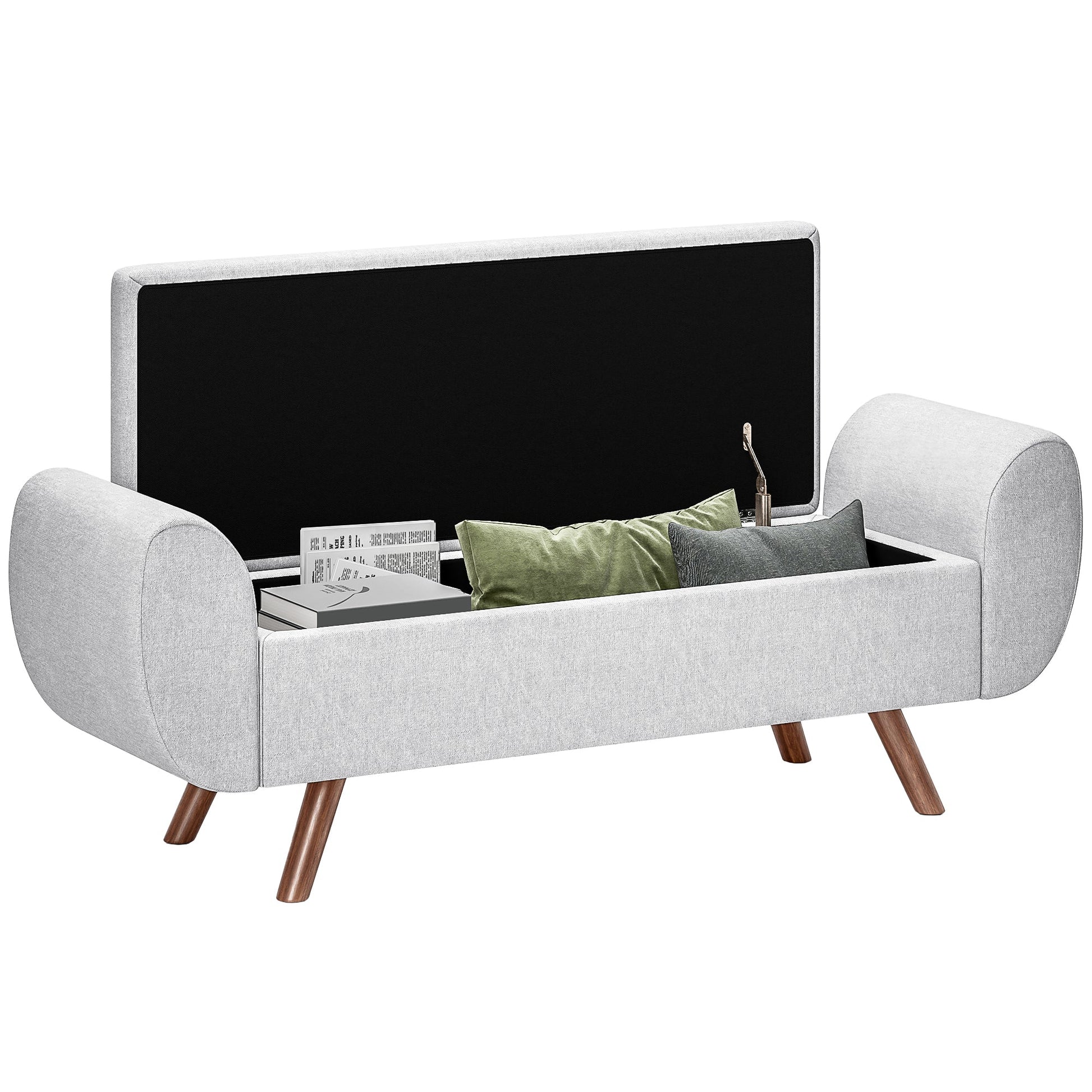 Bedside Storage Bench with Fabric Armrests, Wooden Legs and 53.8L Compartment, 132x42x50 cm, Grey