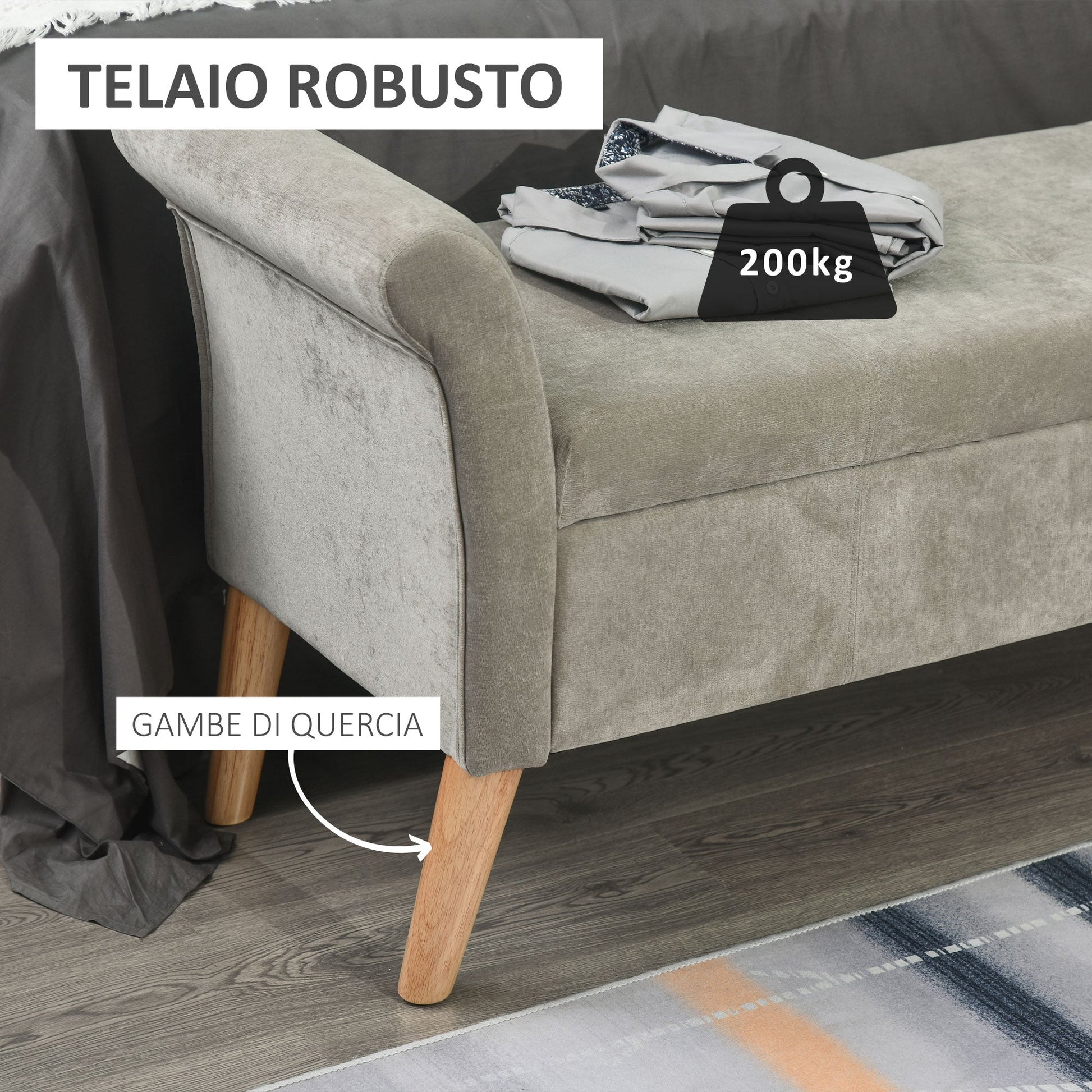 - STORAGE COMPARTMENT: The seat hides a storage container measuring 108L x 37D x 18Hcm with a capacity of 15kg. It opens thanks to metal hinges, offering smooth movement and sturdy support.