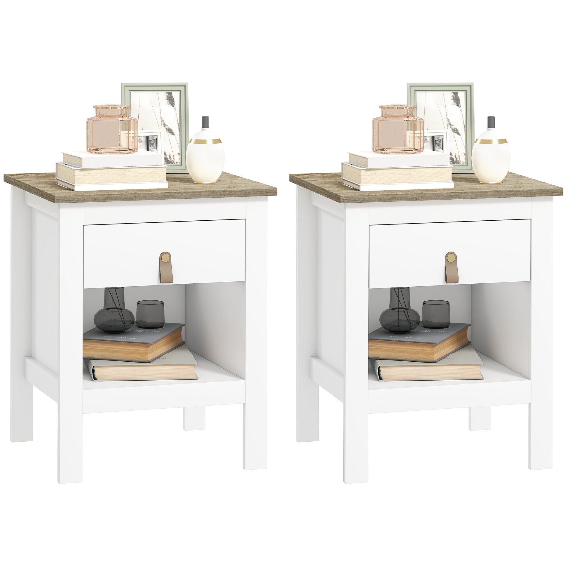 Set of 2 Wooden Bedside Tables with Drawer and Open Shelf, 45x40x55 cm, White and Oak