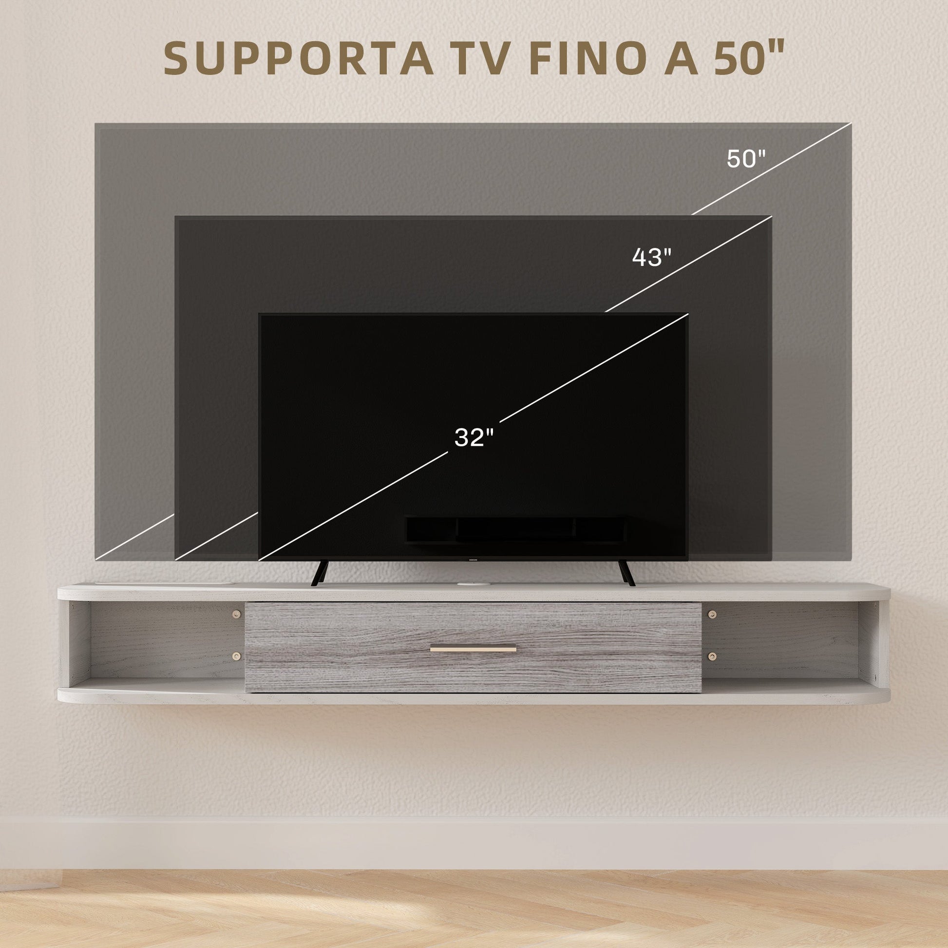 Wooden Wall Mounted TV Cabinet with 2 Open Shelves and Cabinet, 120x26x16 cm, White and Grey