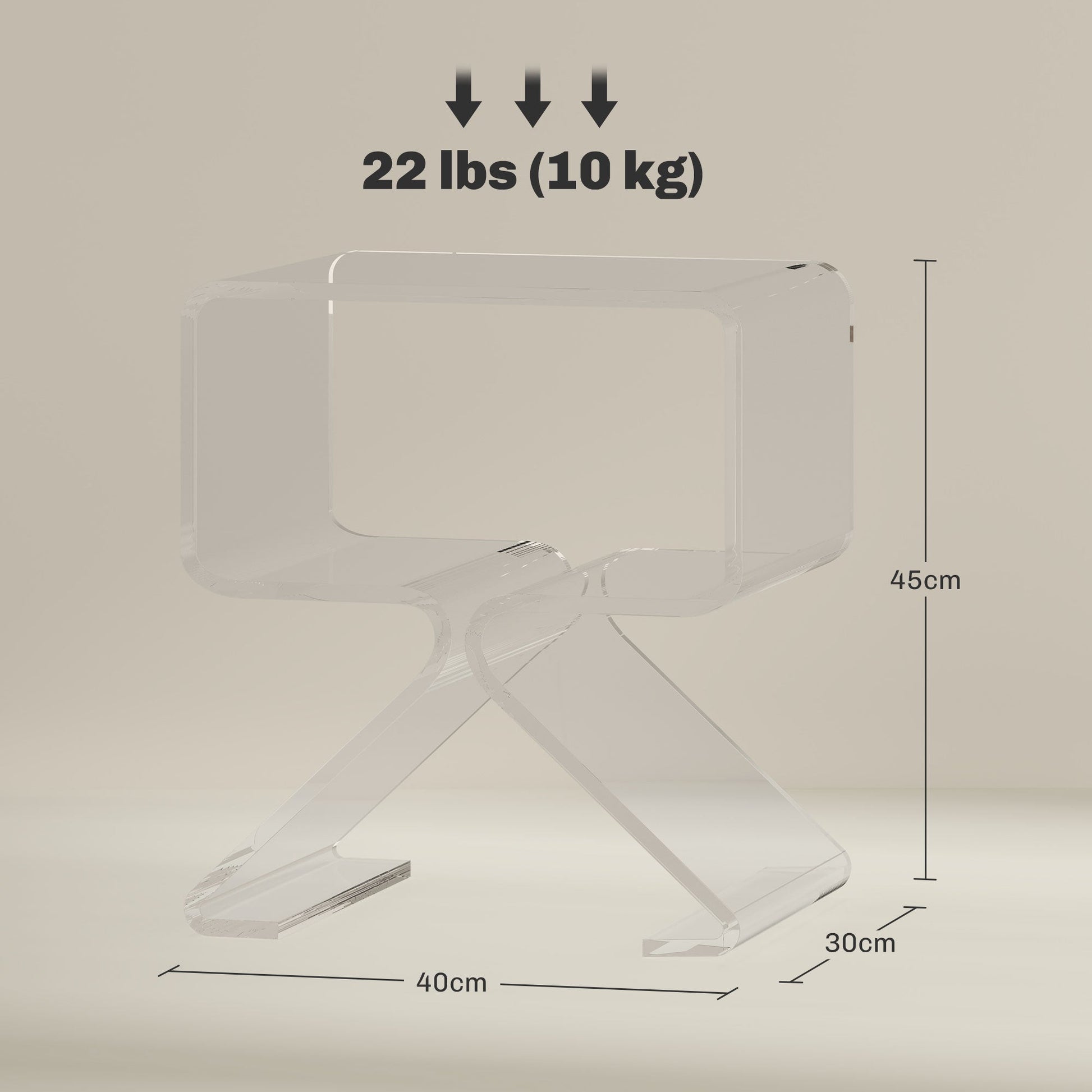 - DIMENSIONS: Overall Dimensions: 40W x 30D x 45H cm. Weight Capacity: 10 kg. No assembly required