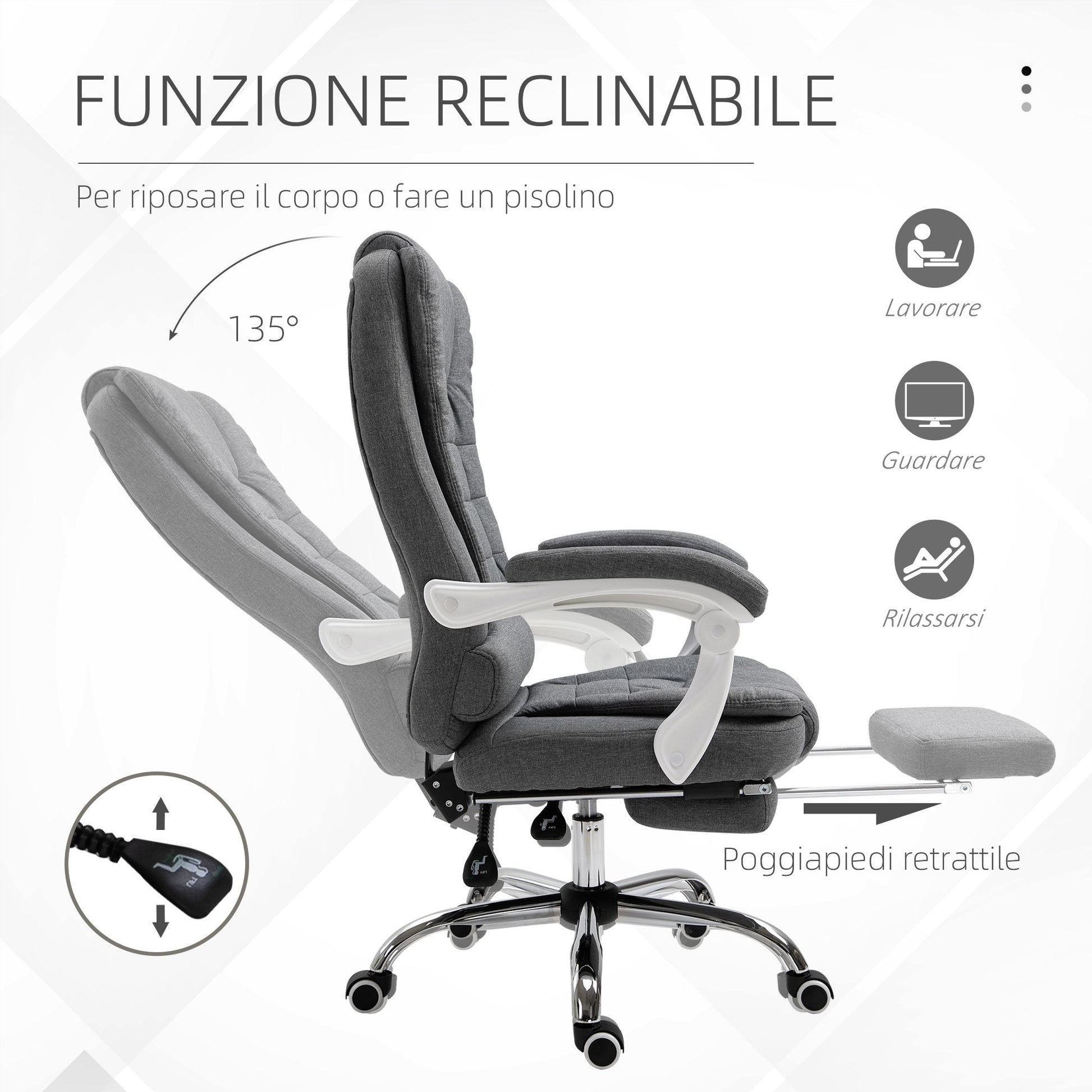 Reclining Office Chair with Retractable Footrest and High Back in Fabric, Grey