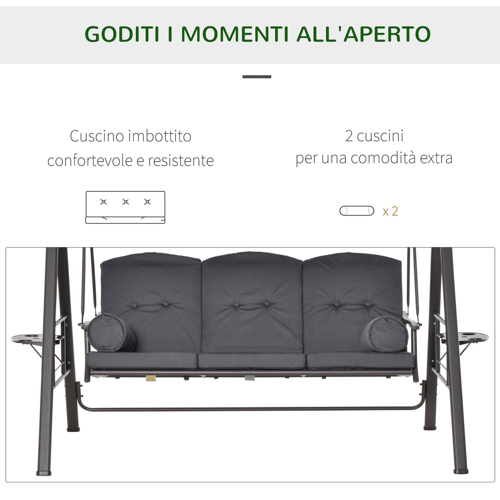 - 3-SEAT SWING: The ideal place to relax in the garden and on the terrace with friends and family. The rust-resistant powder-coated metal frame ensures a long life for outdoor use
