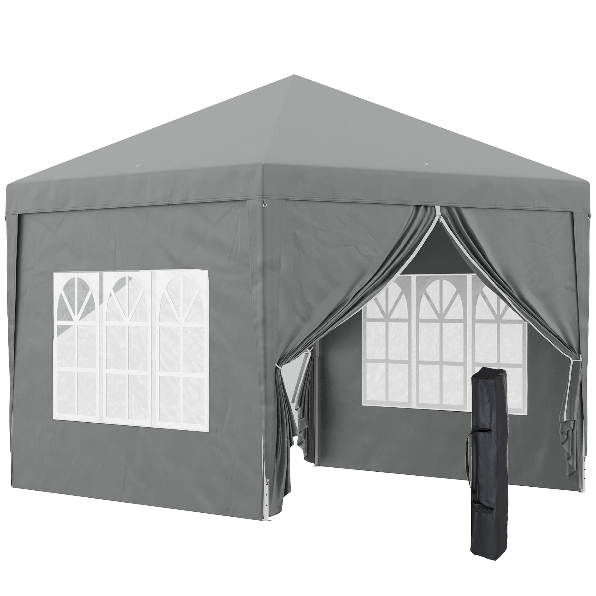 - • Party tent with 4 side panels, 2 of which have a zip opening and 2 with windows