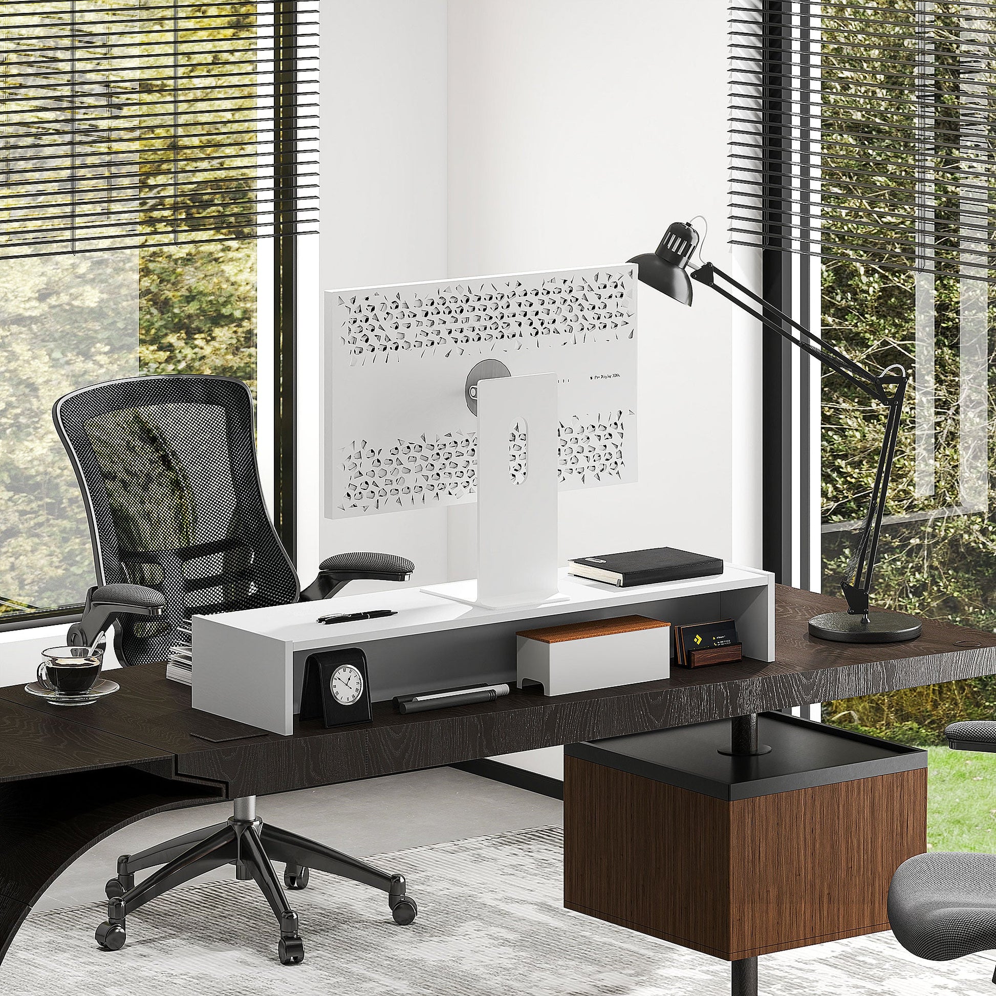 - ORGANIZED WORK SPACE: Featuring two lower spaces, this PC monitor stand allows you to keep stationery, such as notepads and pens, in order, optimizing the space on your desk.